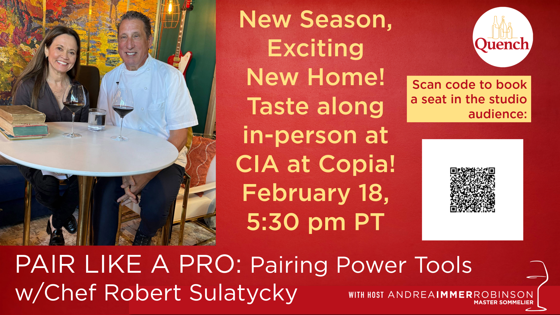 UncategorizedQUENCH AT COPIA IS THE NEW SEASON OF MASTER SOMMELIER ANDREA IMMER ROBINSON’S LIVE VIDEO PODCAST LAUNCHING FEBRUARY 18, 2026 – 5:30 pm PT/8:30 pm ET WITH A DELICIOUS AND FUN IN-PERSON AUDIENCE TASTING & EDUCATION EXPERIENCE UPCOMING EPISODE: February 18, 2026 – Pair Like a Pro with Michelin-Starred Chef Robert Sulatycky, coach of Team […]